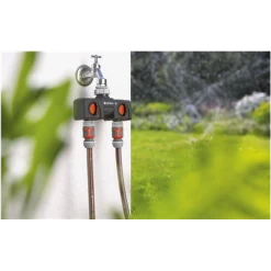 - Op de verdeler kunnen twee GARDENA besproeiingscomputers of watertimers worden aangesloten.
