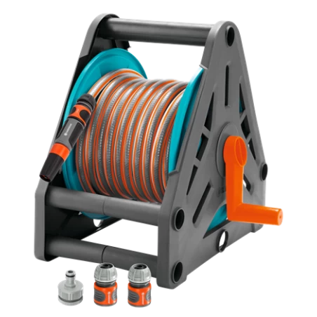 Grote zwengel voor het gemakkelijk oprollen van de slang.