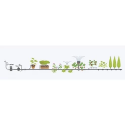 bevat alle componenten voor een zorgeloze en waterbesparende besproeiing van 7 potplanten en 3 bloempotten op balkon en terras. Het druk reducerende basisapparaat is verbonden met de waterkraan via een aansluitstuk. De bloempotten worden individueel en nauwkeurig besproeid via de leidingen met hierop de druppelaars.