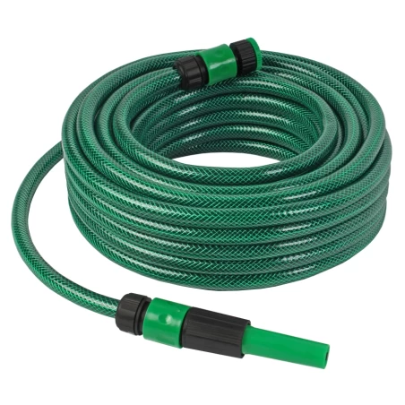 De besproeiingsset bestaat uit een tuinslang 15 meter 1/2″, regelbare spuit, kraannippel, snelkoppeling 1/2″ en snelkoppeling 1/2″ met stop.